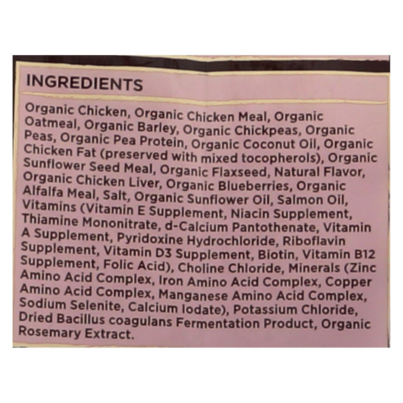 ingredients : organic chicken;organic chicken meal;organic oatmeal;organic barley;organic chickpeas;organic peas;organic pea protein;organic coconut oil;organic chicken fat;preserved with mixed tocopherols;organic sunflower seed meal;organic flaxseed;natural flavor;organic chicken liver;organic blueberries;organic alfalfa meal;salt;organic sunflower oil;salmon oil;vitamins;vitamin e supplement;niacin supplement;thiamine mononitrate;d-calcium pantothenate;vitamin a supplement;pyridoxine hydrochloride;riboflavi